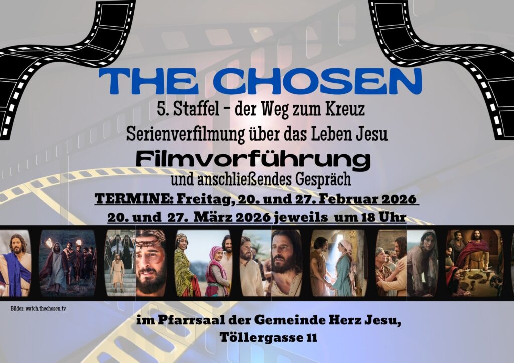 Die Pfarrgemeinde Herz Jesu lädt herzlich zur besonderen Filmreihe „The Chosen“ ein – einer international bekannten Serienverfilmung über das Leben Jesu, die Millionen Menschen berührt und inspiriert. Die Filmreihe bietet allen Interessierten die Möglichkeit, den Glauben in moderner Form neu zu entdecken.